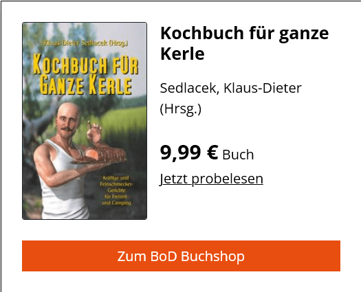 Das Beste aber ist die Einfachheit der Rezepte, die es sogar ganzen Kerlen ermöglichen, ohne kochtechnischen Aufwand, in wenigen Minuten die beeindruckendsten Gerichte hervorzuzaubern. Und das ist es, was dieses Kochbuch für die Verwendung beim Camping oder in der Freizeit ganzer Kerle prädestiniert.